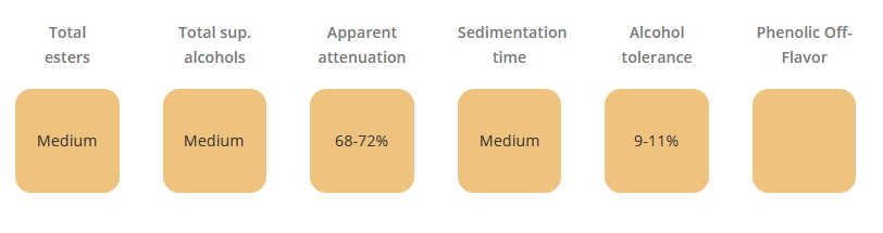 Fruity driven strain, gives a high mouthfeel and body to the beer. Ideal for Belgian Ales (Blond, Dubbel, Tripel, Quadrupel Styles) and strong English ales (ex. Imperial Stouts). It is also ideal for New England IPA’s. Yeast with a medium sedimentation: forms no clumps but a powdery haze when resuspended in the beer.